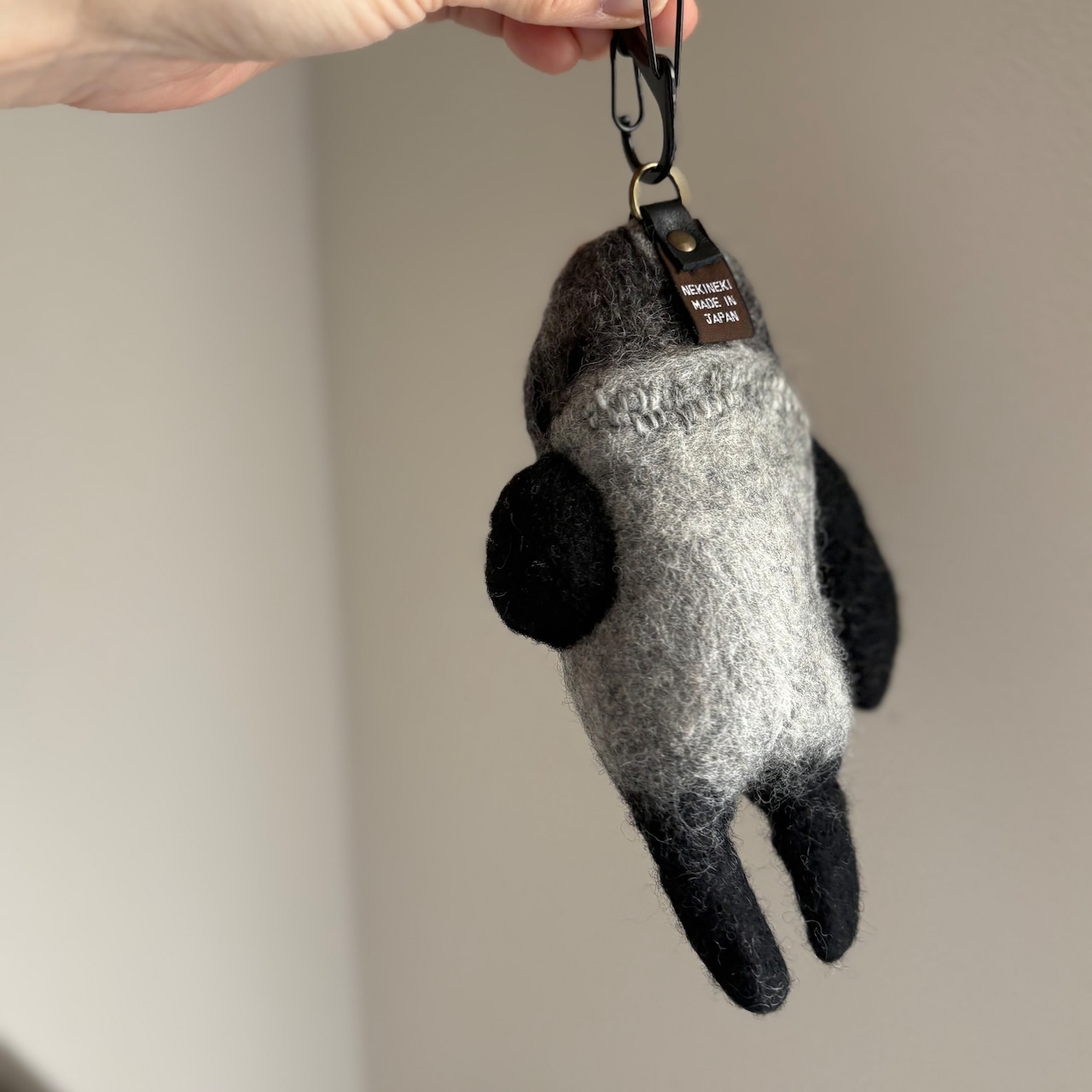 5cmのS字型カラビナをつけておりますので、トートバッグの太い持ち手にも引っかけられます。
