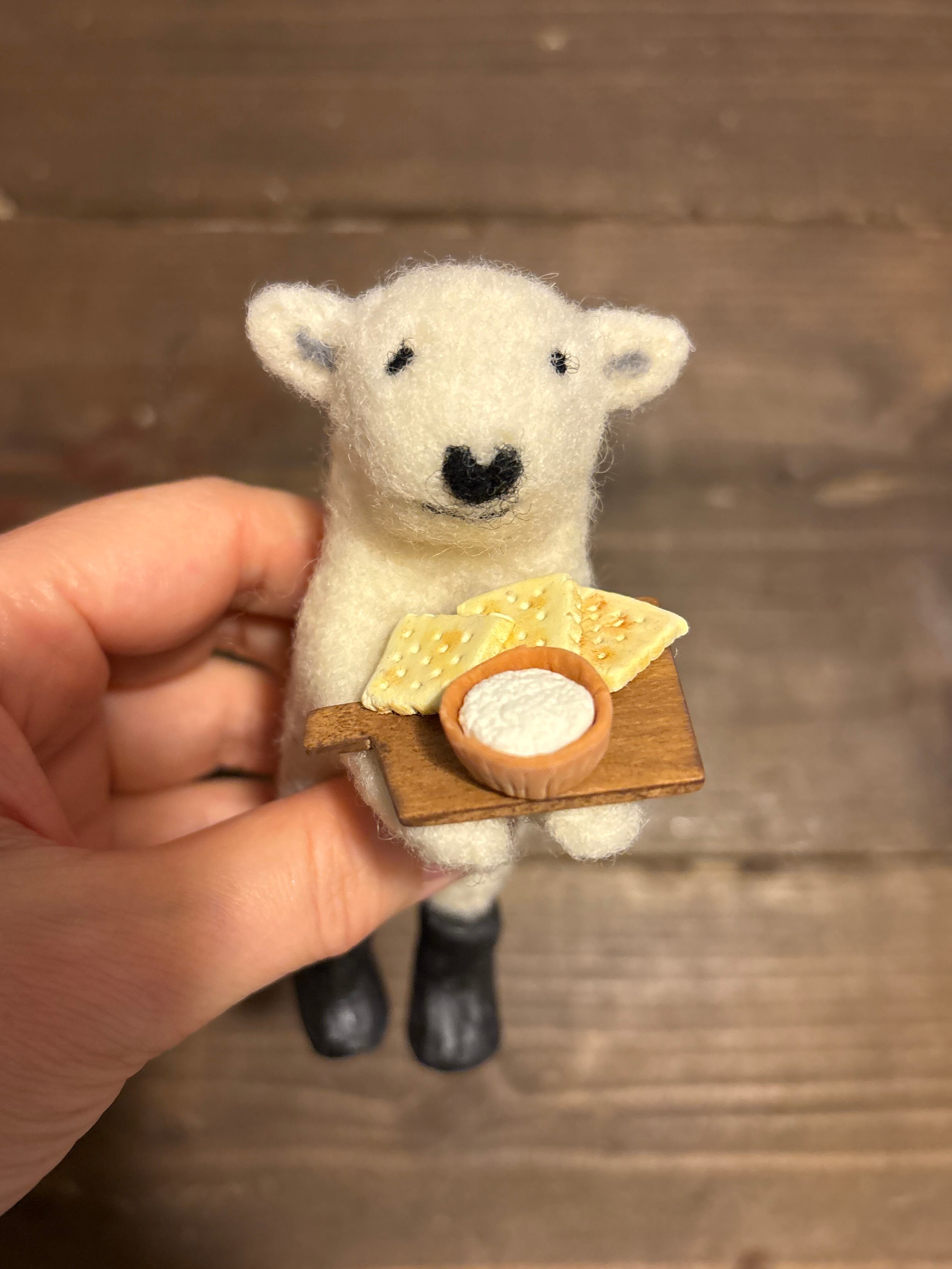 ミニチュアで作ったクラッカーとクリームチーズのセットを持たせました。