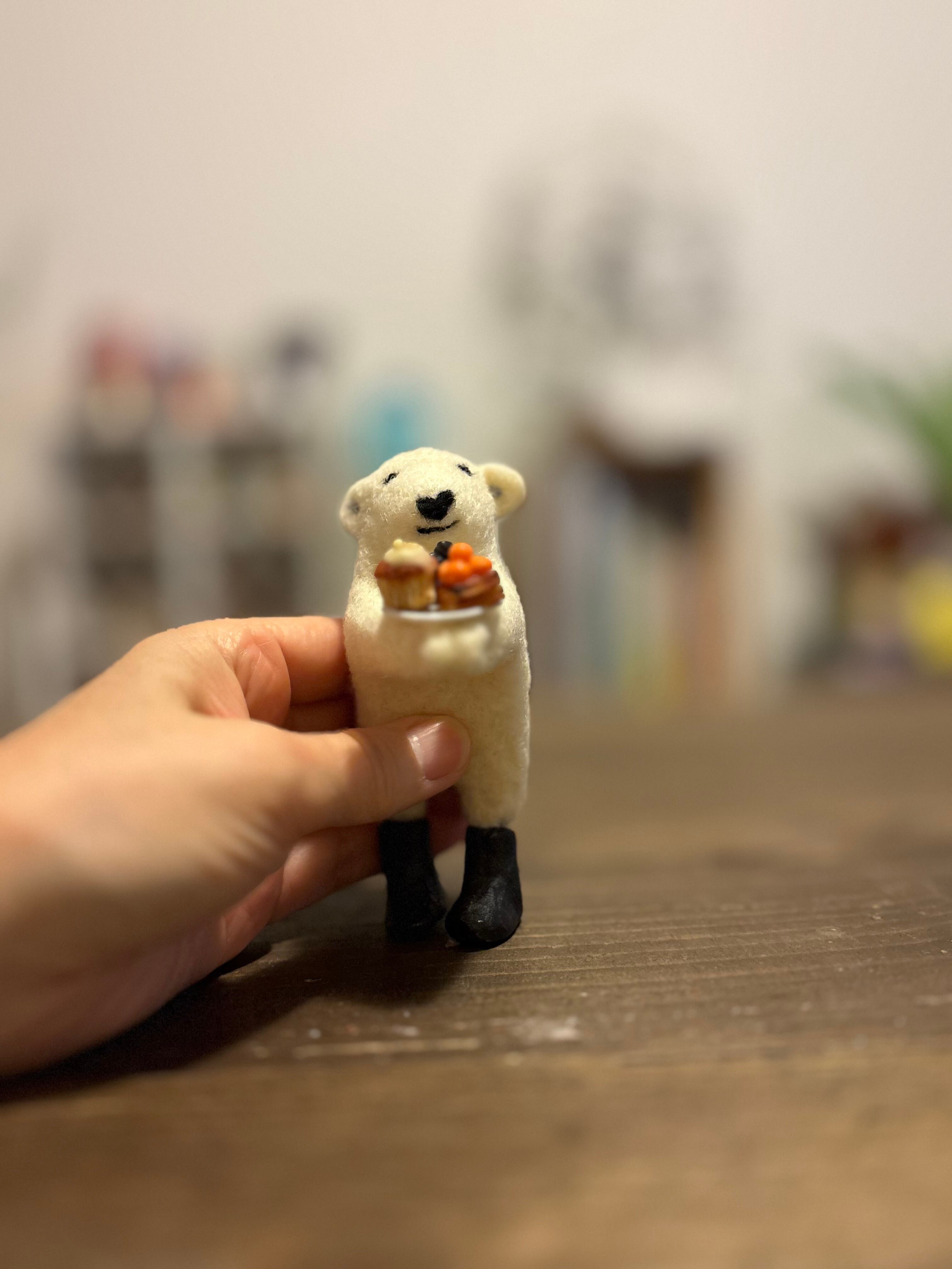 ミニチュアで作ったデニッシュとマフィンのお皿を持たせました。